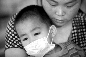 病房內(nèi),身患白血病的小鑫躺在媽媽的懷里。記者 王貴彬 攝