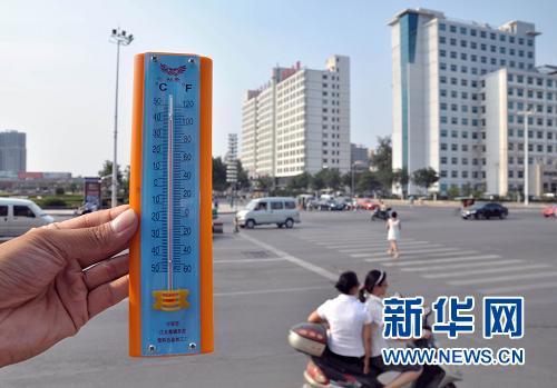 溫“烤”驗下的生活。7月6日16點53分,山西省運城市街頭一位市民手中的溫度計顯示當時氣溫突破40攝氏度。 新華社發(fā)(黃文鵬 攝)