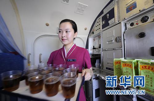 7月6日中午,南方航空公司一位乘務(wù)員準備向機上旅客發(fā)放涼茶。為應(yīng)對持續(xù)的高溫天氣,南航近期開始增加機上消暑飲品的供應(yīng)量,其中涼茶占到機上飲品的4成以上,比平時增加了一倍。新華社發(fā)(徐勤濤 攝)