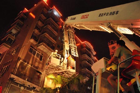 救援人員調(diào)來當(dāng)?shù)匚ㄒ灰惠v32米高的云梯車,救下小伙