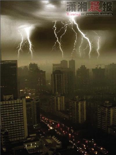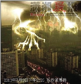 昨日下午2時,一陣電閃雷鳴后,長沙的天空頓時暗了下來,傾盆大雨持續(xù)了一個多小時。隨后一張帶有“2010年7月9日下午2:40長沙芙蓉路”字樣的圖片在貼吧里和各個QQ聊天群瘋狂轉(zhuǎn)載。