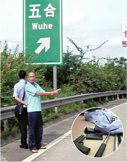 嫌疑人指認(rèn)當(dāng)初攔截莫氏兄弟汽車的作案現(xiàn)場(chǎng)。小圖:嫌疑人作案用的警服和仿真槍等工具 青秀公安分局供圖