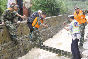 7月7日以來,重慶市東南地區(qū)連日大雨。9日凌晨,一場暴雨突襲渝東南重鎮(zhèn)黔江,武警重慶市總隊第五支隊官兵多路出擊。但一座隨時都有可能垮塌的水泥橋攔住了村民的去路,武警重慶市總隊第五支隊二中隊代理排長王超在一根繩的幫助下,來回83趟將被困的83名村民全部轉(zhuǎn)移。