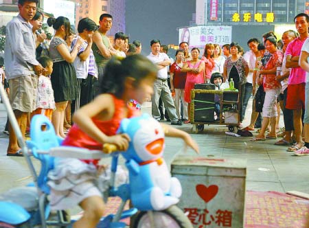 “我要給這個(gè)姐姐捐錢!薄皨寢屛蚁胂蛩I(xiàn)愛心”……經(jīng)常,來納涼閑逛的游客和本地市民,會主動向“愛心箱”里投放各種面值的錢幣,其中小娃娃們是主力,其實(shí)孩子們也是受到家長鼓勵(lì)跑上前去的。一些外國游客也會掏出百元大票表示贊賞和“襄助”。