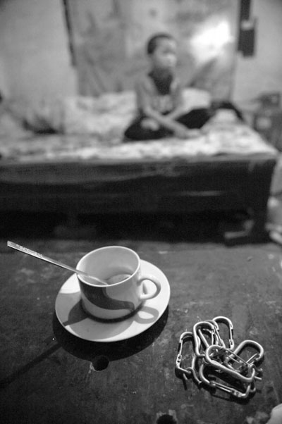 成都武侯區(qū)簇橋街道馬家河村8組28號,10歲的小浩正坐在租住房的床上看電視。他的腳踝上拴著一條指頭粗細的鐵鏈,鏈子的另一頭繞出房門,拴在院子里的一根廢棄的鐵柱子上。