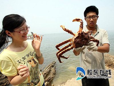 遠(yuǎn)渡重洋來(lái)到煙臺(tái)的這幾只大螃蟹,不但體格超大,而且還有一些“特異功能”呢。矯先生告訴記者,其中那個(gè)名叫“霸王”的大螃蟹有6斤重,展開(kāi)之后能有1米長(zhǎng),售價(jià)近2000元!斑@么大的‘帝王蟹’在國(guó)內(nèi)來(lái)說(shuō)不多見(jiàn)的!背C先生說(shuō)。