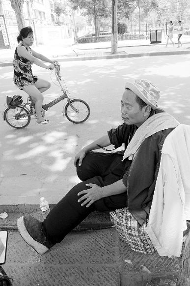 昨天中午12時,鄭州市伏牛路與隴海路交叉口向南的樹蔭里,一個頭戴藍(lán)色漁夫帽的男子引來了不少行人圍觀。