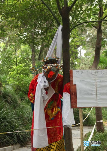 身穿大紅袍,頭戴金冠,脖子套在白布綾挽成的結(jié)上。7月23日下午16時許,鄭州市紫荊山公園內(nèi)一棵大樹下,一男子扮成一“財神爺”模樣欲“上吊”尋短見討回農(nóng)民工血汗錢。