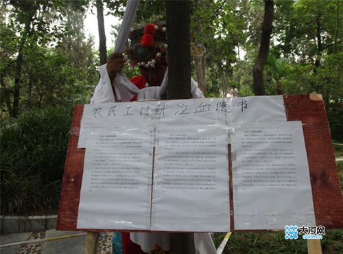 記者在現(xiàn)場看到,“財神爺”旁邊還放著一塊寫著“農(nóng)民工討薪泣血遺書”的木板。上面寫著“誰想死?螻蟻尚且貪生。但我也是被逼無奈,錢我討不到,房租要交,妻母要生活,工人要工資,可老板拿我當(dāng)球踢,我咨詢過很多部門,可都幫不了我,我活得太累了,可死,我也要讓黑心的老板們明白些什么?為了生活,我已經(jīng)向朋友借了九千多元的債,我的大孫女今年才三歲半,她幾乎天天都在告訴我;‘爺爺,我要上學(xué)’,每當(dāng)聽見這句話,我的心都快碎了,二孫女才二十個月,雖然還不知道向爺爺要求什么,但孩子一天天大了,也要上學(xué)了。