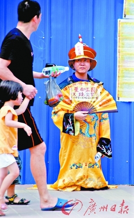 男兒膝下有黃金,下跪路人是為何?昨天,天河公園的門口人行道卻有一位湖南籍男子身著宮廷皇袍,悠然自得地跪在馬路邊,他自稱想用這種“義跪”的另類方式引起廣州人關(guān)注,以推銷他的公益網(wǎng)站。