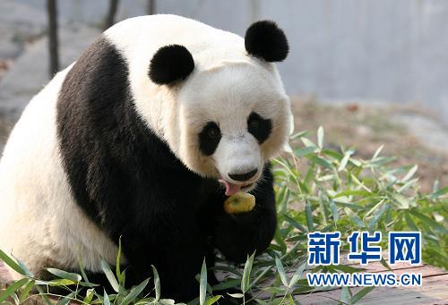 這是大熊貓“泉泉”在濟(jì)南動(dòng)物園吃蘋(píng)果的資料照片(2009年11月24日攝)。