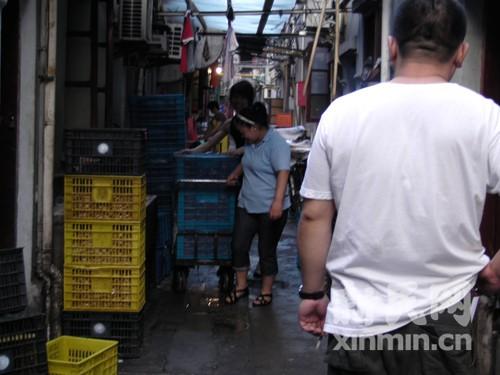 一筐筐洗完的小龍蝦從弄堂中運(yùn)出 新民網(wǎng) 陸俊彥