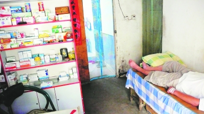 在新蚌埠路與鳳臺(tái)路交叉口西邊城中村內(nèi),一個(gè)狹窄嘈雜的菜市場(chǎng)里,記者走進(jìn)了一家名為“蘇強(qiáng)診所”的小門(mén)診。只見(jiàn)兩間大小約二十平米的平房里,一張桌子上擺放著一個(gè)小電視,桌子下面的一個(gè)大箱子里堆滿了廢棄的藥盒、針管。再加上一架滿放著藥品的藥柜、兩條長(zhǎng)椅和三張單人床,就是這間診所的全部“家當(dāng)”。