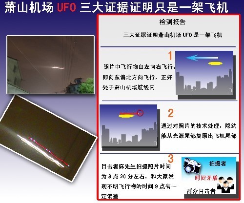 杭州蕭山機(jī)場(chǎng)上空7月7日晚驚現(xiàn)“疑似不明飛行物(UFO)”,致使機(jī)場(chǎng)所有航班停航約1小時(shí),數(shù)千名乘客受影響。次日,新華社發(fā)布消息稱,造成7日晚機(jī)場(chǎng)封鎖,大批航班備降寧波、無錫的正是“不明飛行物事件”。在蕭山UFO事件中,麻先生7日晚拍攝的照片是最引人關(guān)注。民間調(diào)查組7月24日公布了初步結(jié)論,認(rèn)為蕭山機(jī)場(chǎng)UFO事件暫無證據(jù)表明與外星人飛碟有關(guān)。中新社發(fā) 羅京 攝