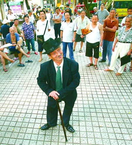 他拄著拐杖,腳成外八字,睜圓了眼睛,不斷地動著嘴唇,時而將拐杖扛在肩上,嘟著嘴巴,做著一連串的搞怪動作,逗得市民捧腹大笑。因動作較大,他一踢腿,腳上的大皮鞋甩飛了,市民們更是笑彎了腰。