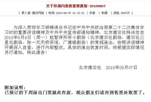 這個(gè)7日凌晨1點(diǎn)多發(fā)布的通知里提到,為深入貫徹學(xué)習(xí)有關(guān)精神,北京德云社特決定自2010年8月9日(周一)起暫停所有小劇場(chǎng)(北京德云社劇場(chǎng)、德云社三里屯劇場(chǎng)、張一元天橋茶館、廣德樓劇場(chǎng))的常規(guī)演出,按照講話精神開(kāi)展深入自查,進(jìn)行內(nèi)部整改。具體的演出恢復(fù)時(shí)間,將根據(jù)實(shí)際情況另行通知。已預(yù)訂的下周演出門(mén)票,就此作廢。