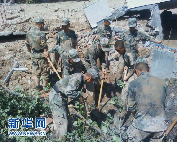 8月8日,蘭州軍區(qū)某集團(tuán)軍防化團(tuán)官兵正在現(xiàn)場實(shí)施救援。新華社發(fā) (王彥軍 攝)
