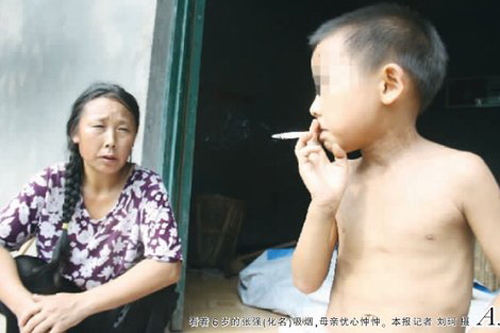 在四川樂山市井研縣某鎮(zhèn)某村,有個6歲的男孩遠(yuǎn)近聞名,因?yàn)樗鼰煶砂a,令人震驚。提起他,周圍的人都搖頭嘆氣:“可惜了,這么小就開始抽煙,以后咋個了得喲?”他們嘴里說的這個孩子名叫張強(qiáng)(化名),雖然年紀(jì)不大,煙齡卻有3年,因?yàn)槌闊,正處于發(fā)育期的孩子長得格外瘦弱。若非親眼所見,看著他嫻熟地吞云吐霧,很難相信這是6歲孩童所為。
