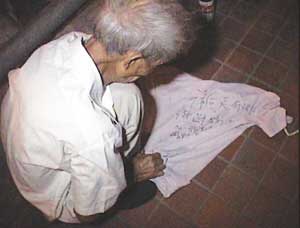 老人蹲在大橋上寫遺書。