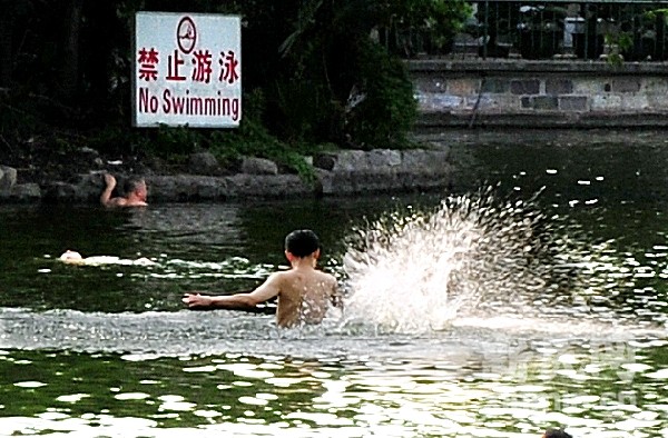 在湖中游泳戲水的人對(duì)岸邊“禁止游泳”的牌子視而不見。新民晚報(bào)記者 紀(jì)海鷹 志愿者 方叢麟 攝