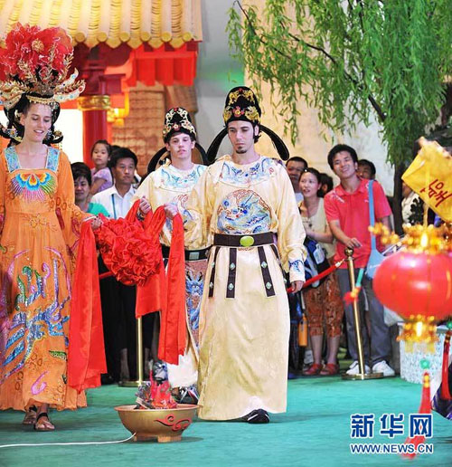 8月14日,在上海世博會陜西館,幾名外國游客在體驗“大唐婚典”。當日,上海世博會陜西館為迎接我國傳統(tǒng)節(jié)日“七夕節(jié)”而舉辦的“華清池中華情人節(jié)系列活動”開幕。兩對外國游客現(xiàn)場體驗了“大唐婚典”,感受中國情人節(jié)的浪漫。新華社記者 丁海濤 攝