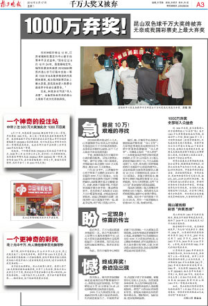 8月16日24時,堅守到最后一刻,福彩雙色球1000萬元巨獎得主也沒有現(xiàn)身,最終成為中國彩市迄今為止最大一筆棄獎。然而,千萬巨獎剛棄一天,就有兩位“得主”冒了出來。昨天下午,蘇州有讀者爆料稱,他朋友的女友購買的彩票中了1000萬元巨獎,因為錯過了領(lǐng)獎時間,這對來自灌南的小情侶“腸子都悔青了”。而另一名爆料人則打來電話,稱自己的老師很有可能才是千萬巨獎的得主。一下子冒出兩個巨獎“得主”,事情真相到底如何?本報記者就此展開追蹤調(diào)查,前者因為爆料人不肯提供當(dāng)事人電話而無法證實,而后者則完全是一出“惡作劇”。