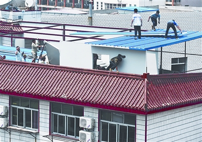 搭個(gè)鐵架、插上泡沫板,一夜之間就能建起一間房,這樣的“速生違建”目前成為武漢市“種房”一族研發(fā)出的新品種。昨日,記者看到,一長(zhǎng)溜白藍(lán)相間的這種泡沫違建,就“長(zhǎng)”在江漢區(qū)黨校路中商平價(jià)超市旁一棟五層樓的城市客棧樓頂。