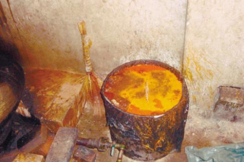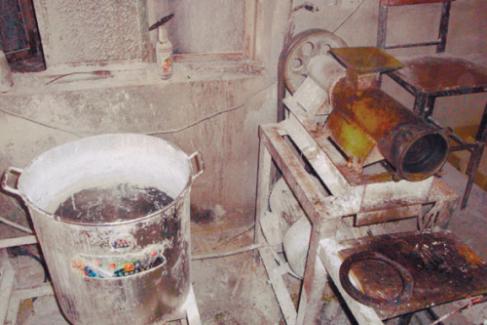 當(dāng)晚19時(shí),在造化街道后丁香村,執(zhí)法人員幾經(jīng)周折找到了這個(gè)黑熟食加工點(diǎn)。推開(kāi)大門(mén),記者就被這里的場(chǎng)景驚呆了。里面臭氣熏天,蒼蠅蚊子亂飛。封閉的平房里好像桑拿房一樣。房間墻壁都發(fā)了霉,一口大黑鍋敞著個(gè)蓋,里面燉著豬頭肉、豬蹄等,兩個(gè)工人用鏟子正在不停地?cái)噭?dòng)。污濁又潮濕的地面上隨意扔著肉骨頭。幾個(gè)水槽里存放著幾盆熟食原料。水是渾濁的,里面漂浮著不少死蒼蠅。