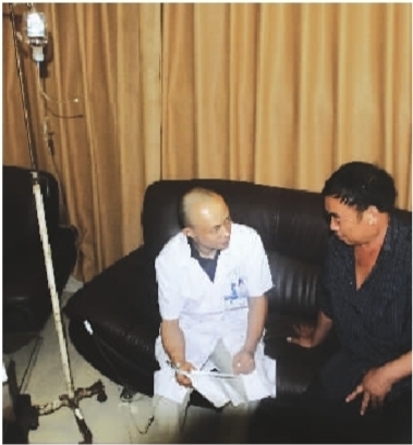8月19日,湘雅三醫(yī)院,戴英波正在吊吊瓶,一名患者過來向他咨詢病情。記者 龔磊 攝