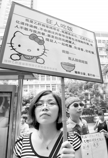 與鋤草一起出現(xiàn)的,還有一位成都本土的志愿者。志愿者舉另一塊牌子做調查,在“你愿意和乙肝病毒攜帶者一起吃飯嗎”的問題下有3個選項,愿意,不愿意,說不清楚。