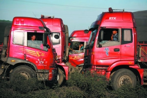 10點(diǎn)30分,記者驅(qū)車來到京藏高速張家口服務(wù)站1公里處,高速下的207國道被堵得嚴(yán)嚴(yán)實(shí)實(shí),馬路上三條道排滿了運(yùn)煤大貨車,記者停車翻越護(hù)欄來到橋下,腳踩之處,灰塵厚約3厘米!扒懊婢褪侨f全站,大貨限制上京藏高速。”據(jù)一名馮師傅介紹,他的車上拉有39噸煤,19日從內(nèi)蒙古東勝出發(fā),經(jīng)110國道,22日晚12時(shí)到達(dá)這條堵塞路段,“10多個(gè)小時(shí),到現(xiàn)在也就前進(jìn)了2公里。你往北走,后面堵了至少七八公里,后面還有更多煤車跟上來!