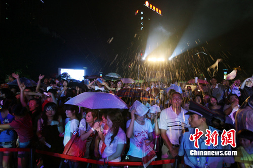 在開幕晚會上,原花兒樂隊主唱大張偉的精彩演出更點燃了重慶市民的熱情,F(xiàn)場隨處可見被啤酒淋得全身濕透的市民,毫不在意地?fù)]舞著手中的熒光棒與臺上的歌手互動。