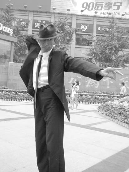 “你看那人好像天王杰克遜!”昨日上午10點(diǎn)過,在中山廣場塑像下,閻華頭戴黑帽、脖系黑帶、身穿黑色西裝,正隨著音樂節(jié)奏表演杰克遜的各種經(jīng)典舞蹈動作:滑步、甩腿、扭胯……