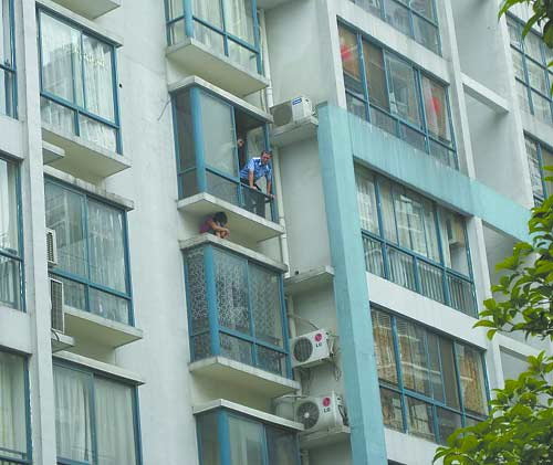 8月29日上午,臨桂縣城金水灣·境界小區(qū)內(nèi),一女子突然爬到三樓窗臺(tái)下的石板上,躲在兩個(gè)窗臺(tái)之間狹小的空隙里,玩起了“躲貓貓”,嚇壞了小區(qū)內(nèi)的居民。經(jīng)過(guò)一個(gè)多小時(shí)的勸說(shuō),公安和消防才將女子安全救出。