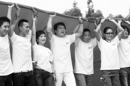 資料圖片:成龍率隊(duì)與北川中學(xué)千名師生共展巨幅國旗。
