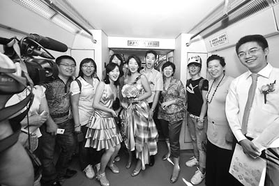 8月28日,北京,一對新人一改平常的婚車車隊(duì)接親,以騎自行車,換城鐵、地鐵的方式到達(dá)婚禮現(xiàn)場,舉辦了一個(gè)綠色、時(shí)尚的婚禮。王勉 攝