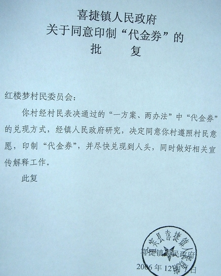 村民出示給記者的代金券印制精美,底色為白色,正面的桔黃色花紋和人民幣的防偽花紋相似。和人民幣一樣,代金券上也印有編碼,面值也分別用大寫的漢字和小寫的阿拉伯?dāng)?shù)字顯示。人民幣上印有“中國人民銀行”的字樣,這些代金券上印的則是“紅樓夢村民委員會”,券面上蓋有村委會公章。代金券背面的“說明”里明確告知,此券可以在“本村村民之間轉(zhuǎn)讓、繼承、贈與”,但沒有標(biāo)注兌換的時間和有效期限。