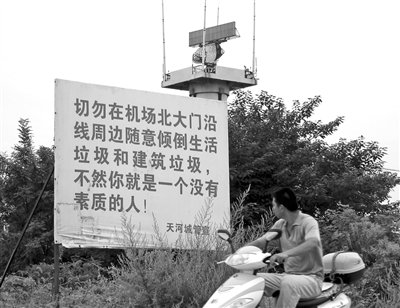 黃陂天河鎮(zhèn)的城管部門,天河機場北大門路旁豎起一面標(biāo)語:“切勿在機場北大門沿線周邊隨意傾倒生活垃圾和建筑垃圾,不然你就是一個沒有素質(zhì)的人”,讓不少過往旅客大跌眼鏡。作為警示標(biāo)語,這樣的遣詞造句確實值得商榷。(高星)