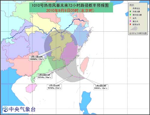 預(yù)計(jì),風(fēng)暴中心將先以每小時(shí)10-15公里的速度向偏西方向移動(dòng),將于8日傍晚前后進(jìn)入南海東北部海面,以后逐漸轉(zhuǎn)向西北方向移動(dòng),并向廣東東部到福建南部一帶沿?拷,強(qiáng)度逐漸加強(qiáng),將于9日夜間到10日上午在這一帶沿海登陸。
