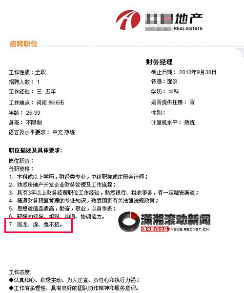招聘單位為河南一家房地產(chǎn)公司,招聘職位為財(cái)務(wù)經(jīng)理,招聘截止日期為2010年9月30日。招聘廣告在“職位描述及具體要求”一項(xiàng)中列出七條要求,除了相關(guān)學(xué)歷、經(jīng)驗(yàn)和個(gè)人素質(zhì)要求外,第七條就是被網(wǎng)友認(rèn)為“很搞笑”的一項(xiàng):“屬龍、虎、兔不招。”