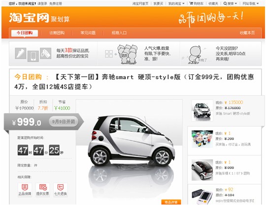 據了解,除了團購活動,奔馳還提供一輛SMART車供淘寶用戶進行1元秒殺。同時提供150輛SMART車模,供用戶以1元的價格進行團購。