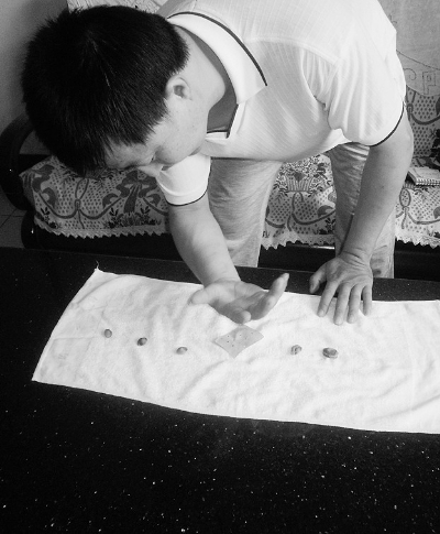 說起砸杏核,是在朋友聚會中,因朋友的一句玩笑話而使他對砸杏核產(chǎn)生了興趣。談話中,張?zhí)珵橛浾弋?dāng)場展示了這個高難度的絕活。只見他將杏核放在鋪平的白毛巾上,排成一字型。運氣、調(diào)整呼吸、伸出右手、擺好手勢,只聽“哈”的一聲,使勁往下一拍,“啪”,杏核均勻地裂開了。隨后,又是啪啪的幾聲,幾個杏核已經(jīng)成碎渣了。記者取了兩個杏核想試試,摸了摸才發(fā)現(xiàn),杏核很堅硬,并且體積非常小,常人很難拍碎。記者粗略算了一下,一分鐘內(nèi)張先生砸碎了十多個杏核。因為手上有傷,為了防止杏核將手背動脈劃破,他只好暫時停止。據(jù)張先生講,在正常情況下,他能拍碎30多個杏核、100多個核桃。(記者 孫建榮 實 習(xí) 生 曹明娟 濮潔瓊 魏雅晴 文/圖)