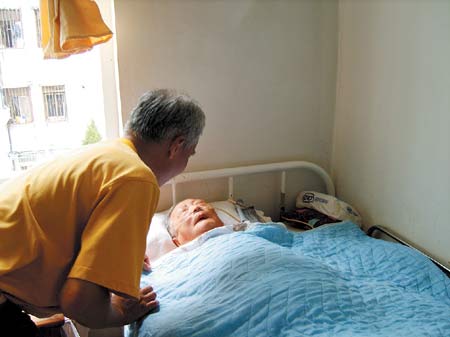 談和平在袁老師病床前。記者王業(yè)全攝