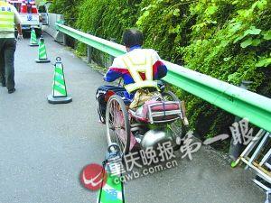 原來,10日晨8時15分左右,一名司機向六大隊報警說,臨近渝黔高速公路東溪段往貴州方向的天平丘隧道,他發(fā)現所有車突然慢下來——原來,路上有個穿反光背心的殘疾中年男子,正吃力駕駛1輛手搖三輪車緩行。駛入緩上坡不久,男子累得滿頭大汗,索性下車手撐三輪車尾,用幾乎半跪半爬方式推車。