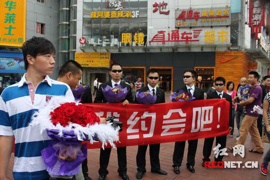 “愿為伊人舍千金,前度劉郎今又來!9月11日長沙市步行街中心廣場,在一群身著黑衣戴黑墨鏡的男士的掩護(hù)下,一名男子手捧鮮花和鉆戒滿臉自信立于前頭。據(jù)悉,這名男子名叫劉航,今年24歲,不甘心8月28日王府井門口的求愛失利,此番再度“來襲”,誓將美人抱回家。劉航表白的對象是參加湖南某電視節(jié)目的女孩雷英。