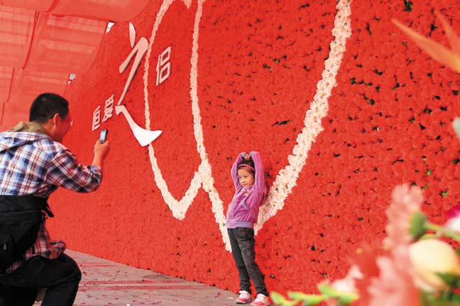 記者看到,酒店外近二十米長(zhǎng)的墻壁上密密麻麻插滿絹制玫瑰,花叢中還有“恒愛之侶”的字樣以及兩個(gè)靠在一起的心形裝飾。