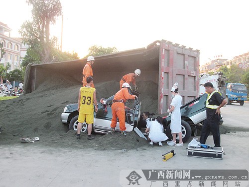 9月18日下午6時許,在田東縣東寧路大西南十字路口,一輛運送沙石的大貨車側(cè)翻壓住一輛皮卡車,皮卡車上的5人當場死亡。