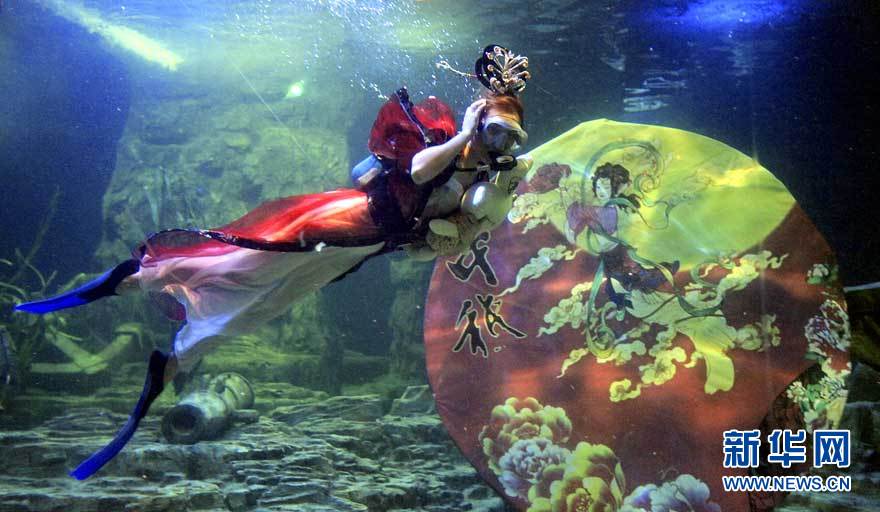 9月22日,扮作“嫦娥”的女潛水員在海底暢游。當(dāng)日是傳統(tǒng)中秋佳節(jié),武漢東湖海洋世界的女潛水員穿上古裝扮作“嫦娥”,為節(jié)日里前來參觀的游客獻(xiàn)上一幕海底“嫦娥奔月”的演出。新華社發(fā)(王振武 攝)