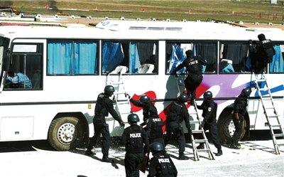 昨天上午,在京郊懷柔某訓(xùn)練場內(nèi),市公安局巡特警總隊首次聯(lián)合武警特警舉行反恐處突聯(lián)合實戰(zhàn)演練,北京特警精銳“藍劍突擊隊”和北京武警總隊國家級反恐力量“雪豹突擊隊”同時亮相。演練中共出動特警隊員400余人,大量反恐特種裝備同時亮相。警方還特別針對菲律賓武裝劫持大巴車事件進行了反劫持演練。