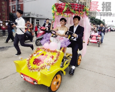 大紅喜字當頭,掛著心形花環(huán)和氣球,婚車上該有的裝飾應有盡有,唯一的不同就是轎車變成了雙人腳踏車。昨日上午,家住(長沙)星沙的新郎張世明動用了六輛雙人腳踏車,載著相戀七年的愛人,踏上了幸福的婚姻之路。新郎說“腳踏婚車”還是新娘想出的點子,認為更有新意,也符合80后們低碳環(huán)保的生活態(tài)度。(劉英杰 記者 黎棠 韓敬宇)